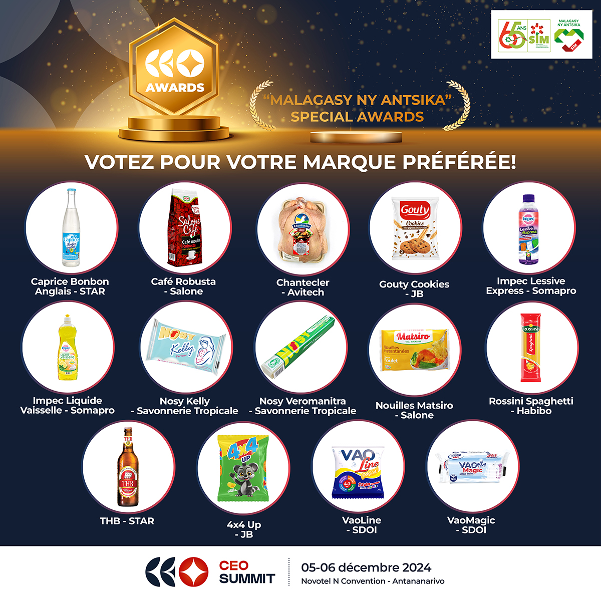 Nous sommes fiers d’annoncer que deux de nos produits phares, les Nouilles Matsiro Salone et le Café Salone Robusta, participent au prestigieux prix « Malagasy Ny Antsika Special Awards 2024 » lors du CEO Summit 2024.