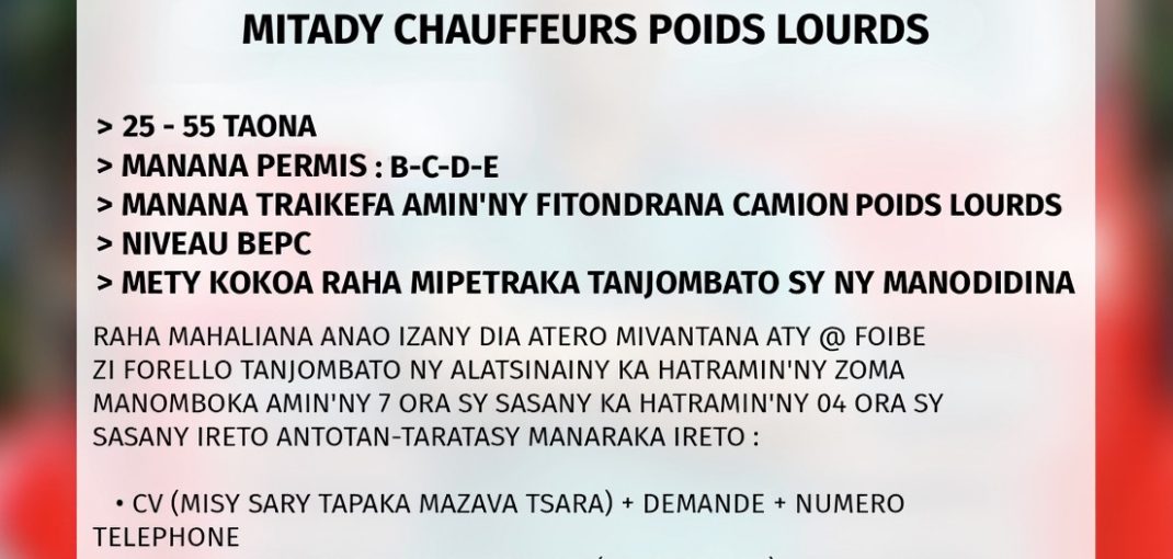 Profil recherché : * Âge : 25 à 55 ans * Permis B, C, D, E requis * Expérience confirmée en conduite de camions poids lourds * Niveau BEPC minimum * Résider aux alentours de Tanjombato ou ses environs. Dossier de candidature : * CV avec photo + coordonnées + demande * Photocopie du certificat […]