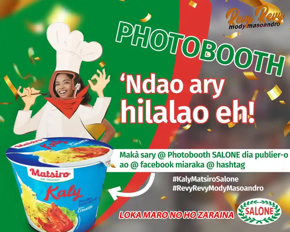 Ce n’est pas tout ! Prenez des photos au photobooth Salone lors de l’événement, postez-les sur les réseaux sociaux avec les hashtags #KalyMatsiroSalone et #RevyRevyModyMasoandro. Les trois photos avec le plus de réactions seront récompensées avec des paniers-cadeaux comprenant un assortiment de produits Salone et d’autres surprises. Fin du jeu le 1ᵉʳ août, annonce des gagnants le 2 août.